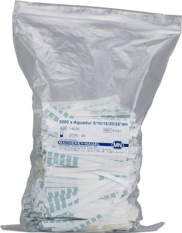 AQUADUR-Teststäbchen Abstufung: 5 > 10 > 15 > 20 > 25 Grad dH Beutel à 5000 Stäbchen lose Schüttung