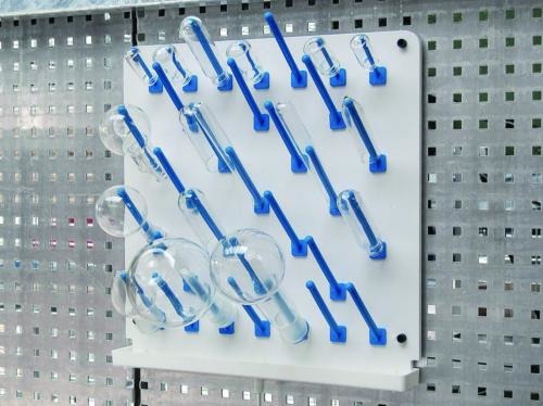 Die stabilen Aufsteckstäbe können individuell in die Aufnahmebohrungen des Abtropfbrettes eingesteckt und arretiert werden und sind jederzeit wieder umsteckbar. In Kombination mit den verschieden langen Aufsteckstäben (60mm, 100mm und Verlängerung auf 150mm Länge) kann das Abtropfbrett an jegliche zu trocknende Geräte angepasst werden.