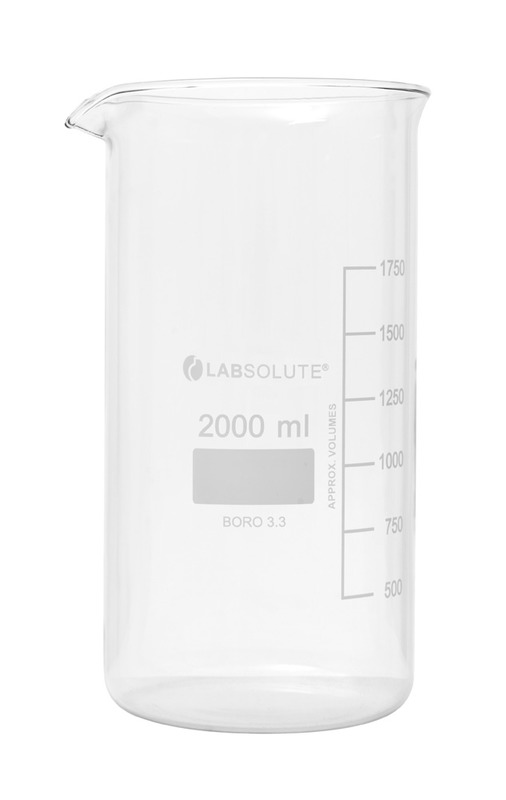 Bechergläser, hohe Form, aus Borosilikatglas 3.3, mit dauerhafter, aufgedruckter Volumenskala und Ausguss, 2000 ml, gemäß DIN 12331 und ISO 3819, VE=6, LABSOLUTE®, 6 Stück