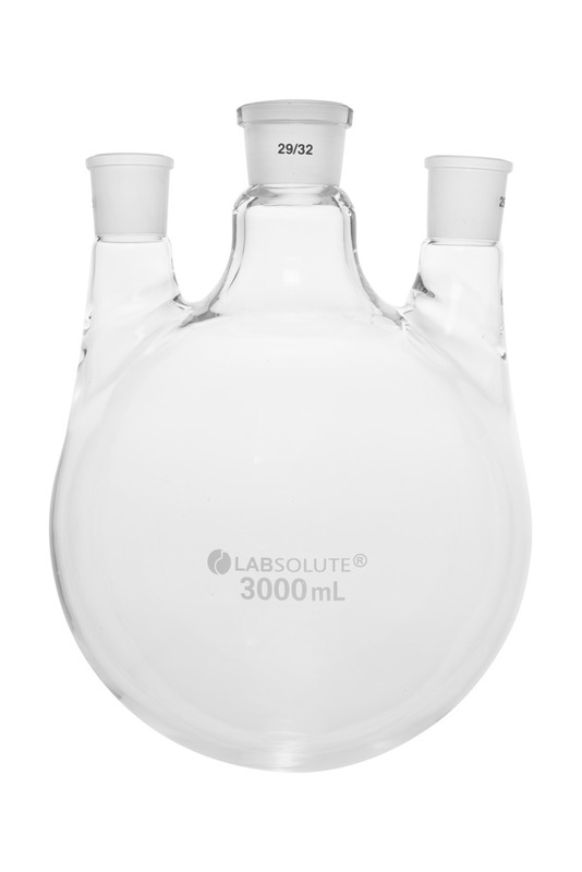 Dreihals-Rundkolben, Seitenhals parallel, 3000 ml, MH 29/32, SH 29/32, gemäß DIN 12392, Borosilikatglas 3.3, VE=1, LABSOLUTE®, 1 Stück