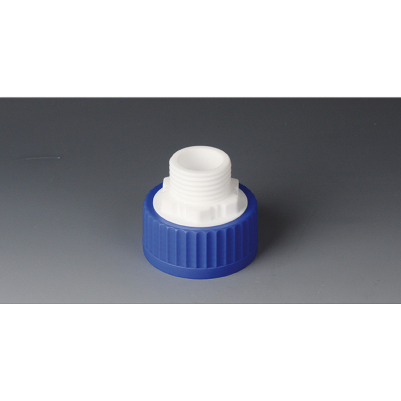 Schraubkappe blau aus PP für Gewinde GLS 80 mit beweglichem Einsatz mit GL 45 Gewinde aus PTFE. Übergang von GLS 80 Flaschen auf das Gewinde GL 45. Durch den beweglichen Reduzierstutzen kann das Gefäß ohne vorherige Demontage angeschlossener Geräte gewechselt werden, da Schläuche und Kabel nicht verzwirbeln können. Das Medium kommt nur mit PTFE in Berührung., Abmessungen: für Gewinde GLS 80, Reduziergewinde GL 45