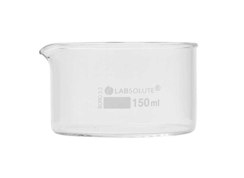 Kristallisierschale, 150 ml, Ø=80 mm, h=45,mm, aus Borosilikatglas 3.3, klar, zylindrisch,gemäß DIN 12338, mit flachem Boden und,Ausguss, VE=1, LABSOLUTE®, 1 Stück
