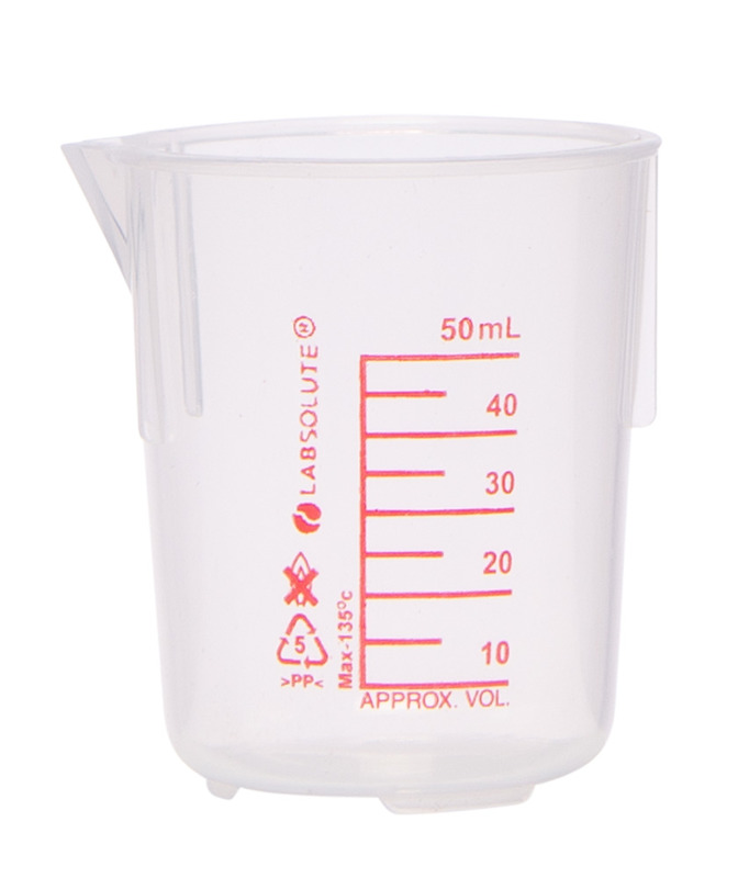 Messbecher ohne Griff (Griffinbecher), 50 ml,aus PP, gemäß ISO 7056, rote Skala, VE=1,LABSOLUTE®, 1 Stück
