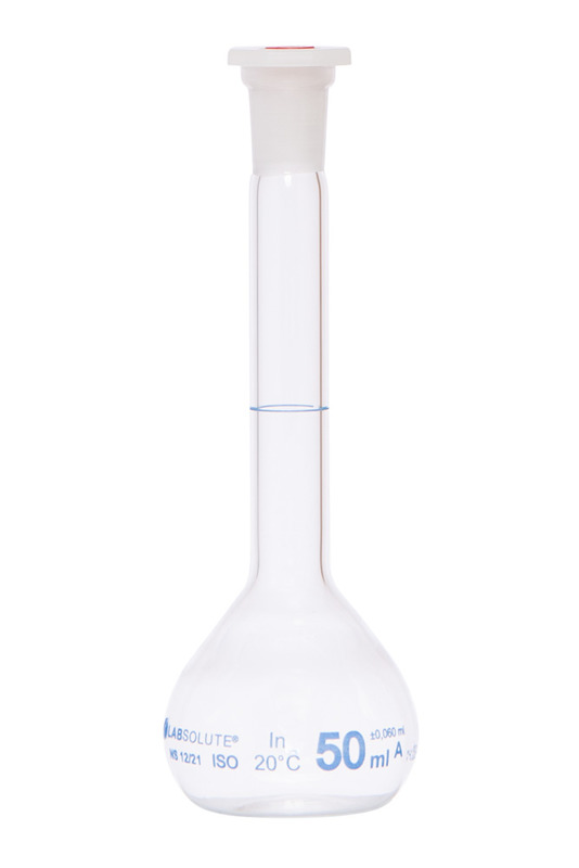 Messkolben, Klarglas, Borosilikat 3.3, 50 ml, NS 12/21, mit PE-Stopfen, Klasse A, blaue Beschriftung, gemäß DIN EN ISO 1042, VE=1, LABSOLUTE®, 1 Stück
