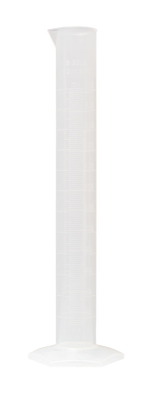 Messzylinder, 50 ml, hohe Form, Klasse B, Graduierung 1,0 ml, Höhe 200 mm, PP, erhabene Skala, justiert auf In (20 °C), gemäß DIN 12681 und ISO 6706, Sechskant-Fuß, mit Auslauf, VE=1, LABSOLUTE®, 1 Stück