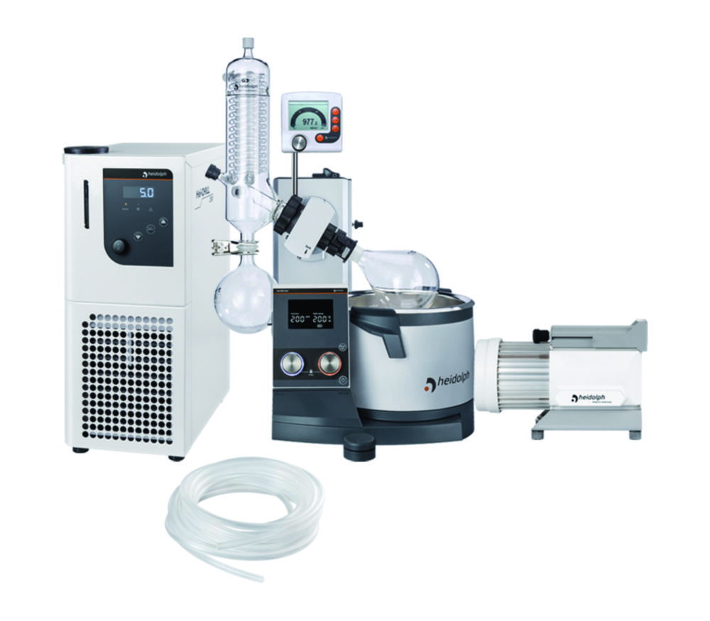 Lieferumfang: Hei-VAP Core mit Handlift und vertikalem Glassatz G3, Vakuumregler Hei-VAC Control, Vakuumpumpe Rotavac Valve Tec, Schlauch-Set, Umlaufkühler Hei-CHILL 250, Temperierflüssigkeit Kryo 30 (10 l)